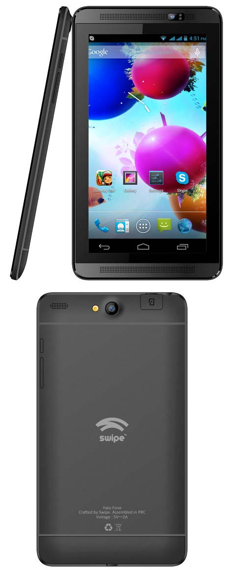 Тыловая камера изделия Swipe Halo Fone имеет 2МП сенсор и оснащена LED вспышкой, а фронтальная имеет 0.3МП сенсор. Размеры агрегата составляют 183x101x9мм, вес равен 235 граммам. FM радиостанции планшетофон ловит и позволяет их слушать, в том числе через 3.5мм аудиовыход.