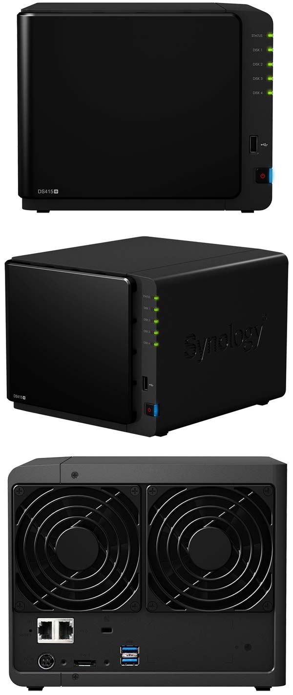Размеры новинки составляют 165x203x233.2мм, вес равен 2.05КГ. Устройство имеет два гигабитных Ethernet порта; помещённые внутрь агрегата накопители охлаждаются парой 92x92мм вентиляторов, шумят которые на уровне 20.2дБ. В новинку встроен блок питания на 100 ватт, хотя энергопотребление DS415+ составляет 46.2 ватта в нагрузке и 17.3 ватта в простое.