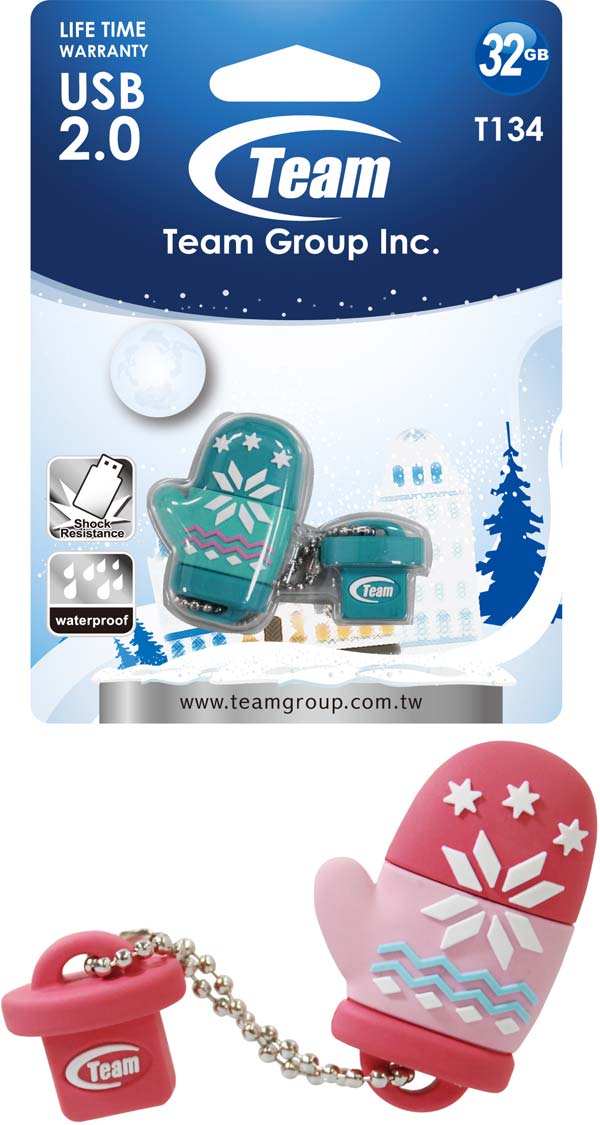 Что же делает флешку T134 новогодней, помимо её оформления? С накопителем в комплекте идёт эдакая резиновая варежка, соединённая с флешкой металлической цепочкой. Цвет как варежки, так и новинки от Team Group может быть зелёным, а может быть и розовым. На корпусе T134 нет светодиодов активности, зато аппарат поддерживает экономию энергии. Доступная ёмкость изделий серии - 8, 16 и 32ГБ.