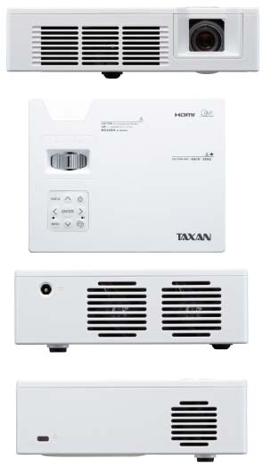В корпус проектора от TAXAN встроена пара 2-ваттных динамиков. Изделие не поддерживает показ 3D изображения, частота вертикальной развёртки - 80Гц максимум. Новинка обладает D-Sub/VGA и HDMI видеовходами, аудио мини-"джеком", RCA коннекторами и одним портом USB.