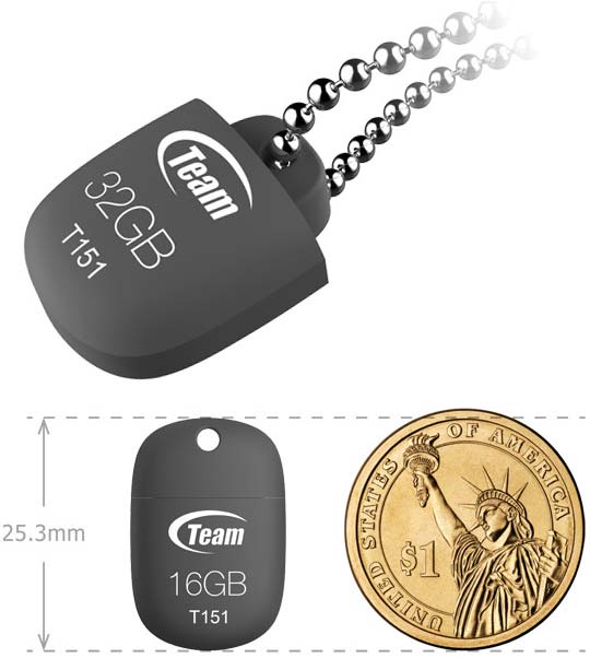 Изделие именуется T151 и является мало чем примечательным агрегатом. К числу достоинств накопителя можно отнести резиновый корпус, благодаря которому девайс устойчив к повреждениям из-за падения или несильных ударов, а также малые размеры. Флешка использует технологию COB (Chip On Board), а значит устойчива к воде и пыли. Подключение осуществляется по интерфейсу USB 2.0, что в наше время несколько неактуально. Ёмкость решений серии T151 составляет 8, 16, 32 и 64 гигабайта, доступные цвета флешки - серый и синий, размеры: 25.3x16.9x10.5мм, вес равен 5.5 граммам.