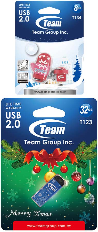 Ну а что - вполне логично, в праздники у людей обычно хорошее настроение, поэтому им легче продать что-то, имеющее весёлый "зимний" дизайн. Нашему вниманию предлагают две новинки, одну из которых мы уже видели в октябре. У T123 алюминиевый корпус, доступный в красном и синем цветах с изображённой на нём лазером новогодней ёлкой (на Западе её называют "рождественское дерево") и снежными хлопьями. Изделия используют технологию COB, а значит не боятся пыли и в меру прочны. Ёмкость решений - 8, 16 и 32 гигабайта