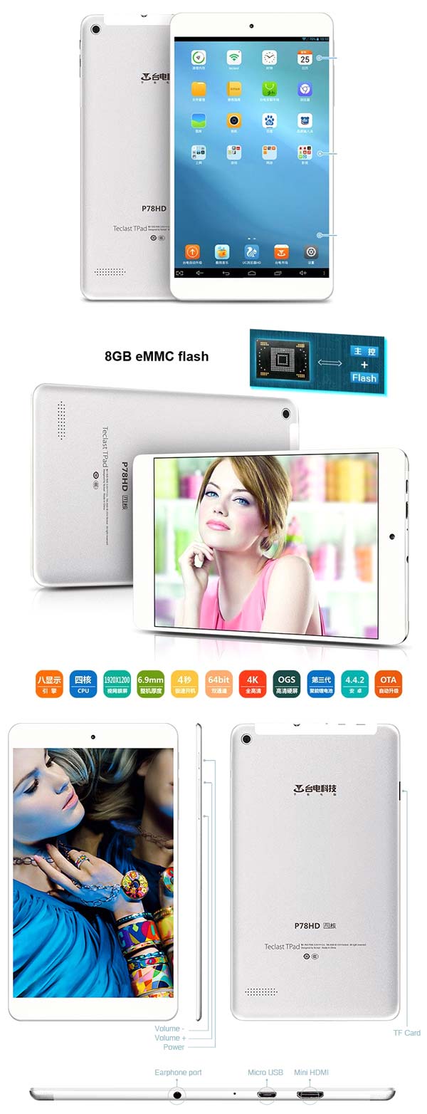 Teclast P78HD может похвастаться 7" IPS Retina дисплеем с разрешением 1920x1200, основой изделия стала 1ГГц четырёхъядерная SoC Allwinner A31 с графикой PowerVR SGX 544MP2. Объём оперативной памяти равен 1ГБ, места для нужд владельца выделено 8ГБ и его разрешено расширить.