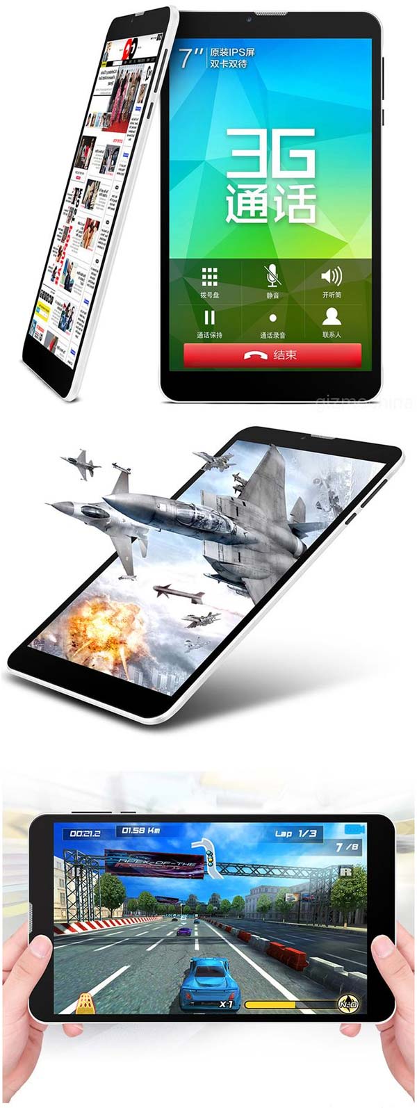 Корпус планшета сделан из белого пластика, управляется агрегат Android 4.4, поддерживает 802.11b/g/n WiFi и Bluetooth 4.0, а также 3G (WCMDA). Тыловая камера получила 2МП сенсор, фронтальная - 0.3МП сенсор. Динамики выдают звук в стерео-режиме, в наличии порт Micro USB 2.0, 3.5мм аудиовыход и два слота для SIM карт обычного размера.