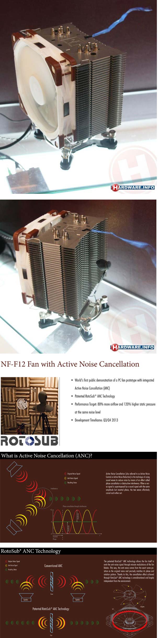 Примерно через год Noctua в содружестве с компанией RotoSub начнёт выпуск систем воздушного охлаждения, оборудованных активным подавлением шума. Как работает эта технология я разбираться не стал, на мой взгляд это совсем не важно, лишь бы был положительный эффект, а кто разобраться захочет - почитает слайды ниже и посмотрит соответствующее видео там же. Ясно одно - если у Noctua случится прорыв в этом деле и будет достигнута цель (на 80% больший воздушный поток и на 120% большее статическое давление при том же уровне шума), то множество производителей кулеров захотят реализовать схожие решения, уж не знаю каким образом. А уж тогда рынок заполнится невиданными по соотношению шум/производительность решениями.