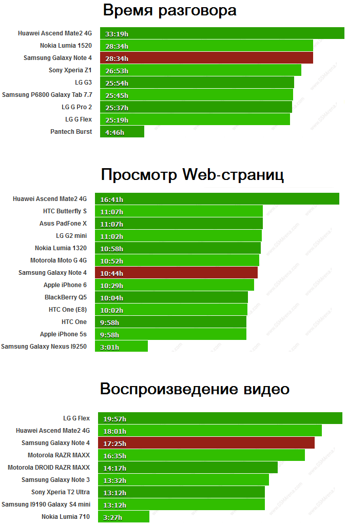 Тесты проведены ресурсом GSM Arena, как всегда, замерялось время работы от батареи в режиме разговора в сетях 3G (3G Talk Time), время функционирования в режиме просмотра Web-сайтов в Интернет (Web Browsing), а также время проигрывания HD видео (Video Playback).