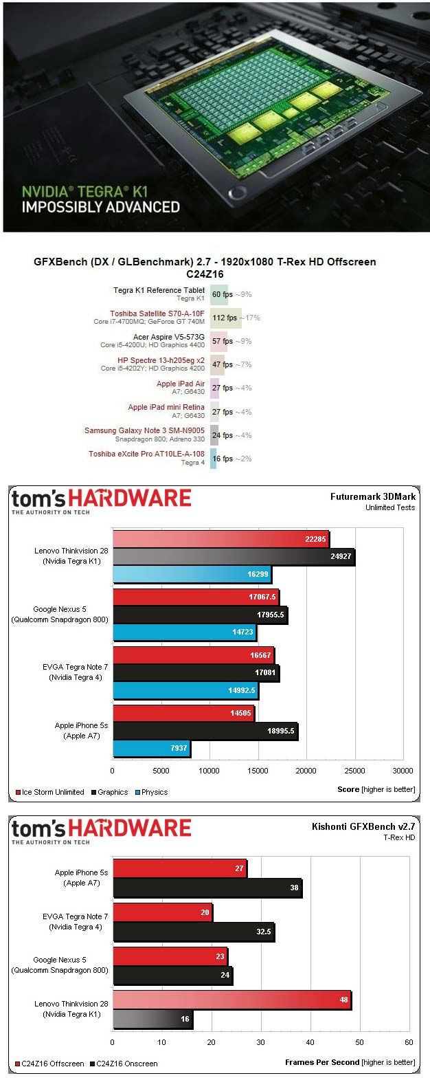 Безоговорочная победа в каждом тесте весьма впечатляет. Единственное решение, которому Tegra K1 проиграла в первом бенчмарке - обладающая TDP в 45 ватт видеокарта GeForce GT 740M. Учитывая, что TDP у Tegra K1 ниже в 20 с лишним раз, новое творение Nvidia впечатляет ещё больше.