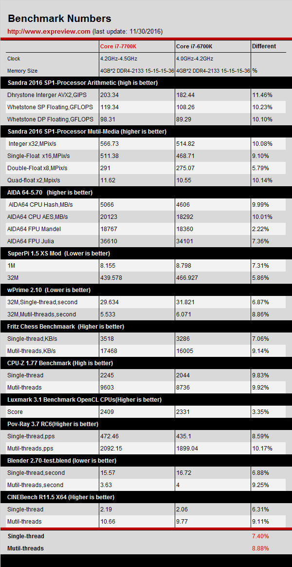 Мои китайские коллеги с EXPreview провели тест нового процессора Core i7-7700K (Kaby Lake), сравнив его с аналогом предыдущего поколения, причём бенчмарки гонялись на системной плате на базе чипсета Z270.