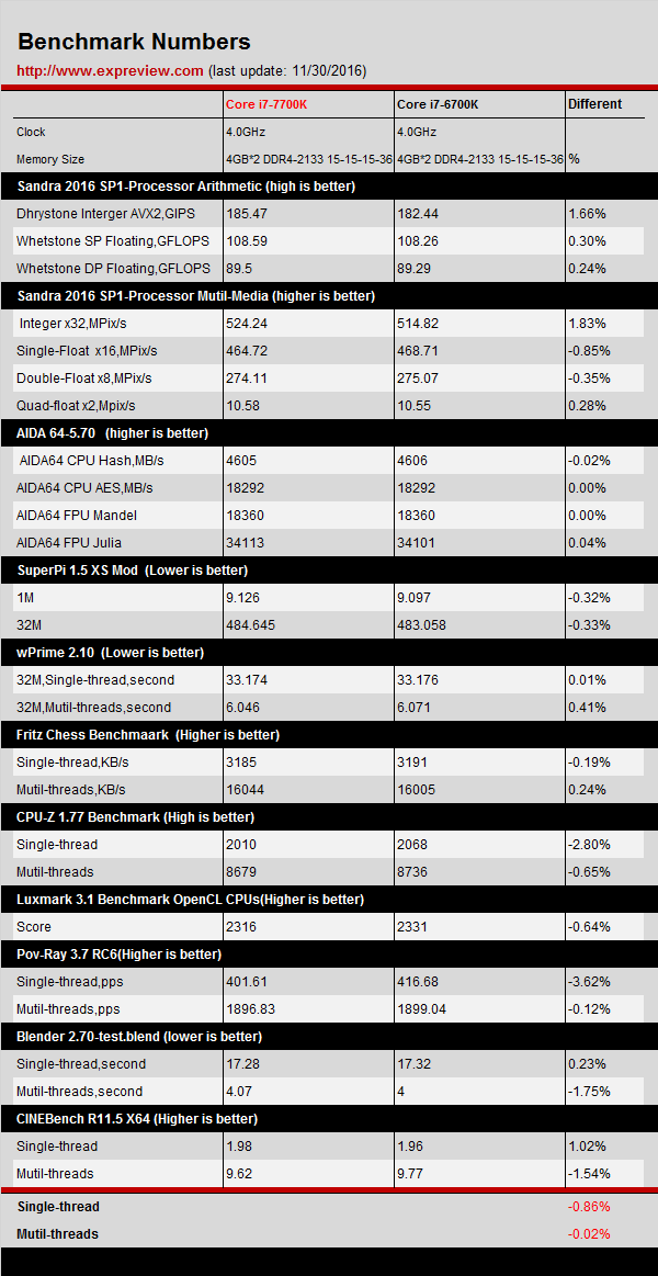 В первой табличке мы видим примерно 8.88% преимущество Kaby Lake в многопоточных тестах и 7.40% в однопоточных, главным образом из-за разницы в рабочих частотах. Во второй табличке, где процессоры поставлены в равные условия, разница крайне мала (более того - победа на стороне процессора предыдущего поколения) и составляет -0.02% в многопоточных тестах и -0.86% в однопоточных. Выводы можно сделать самостоятельно...