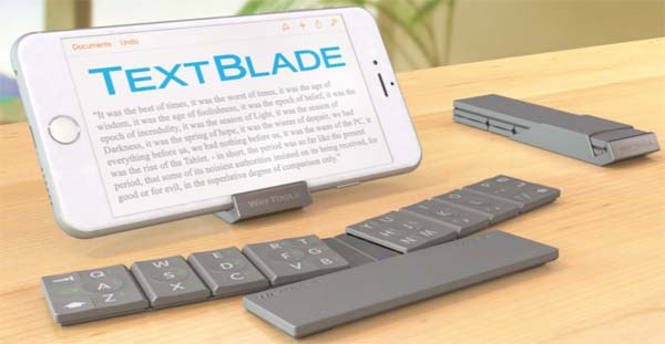 Изделие TextBlade является складной механический клавиатурой, размеры которой составляют 104x30.6x11.3мм, а вес равен 1.5 унциям. Сделано устройство из поликарбоната и стали, в ней также используются неодимовые магниты и силикон. Новинка совместима со всеми более-менее новыми устройствами, управляемыми Android, а также девайсами от Apple с iOS, связь осуществляется по Bluetooth 4.0 LE. Питается TextBlade от литий-полимерной батареи, поддерживающей быструю зарядку от порта USB или от NanoCharger. Части клавиатуры скрепляются между собой при помощи тех самых магнитов, а NanoCharger интегрирован в девайс.