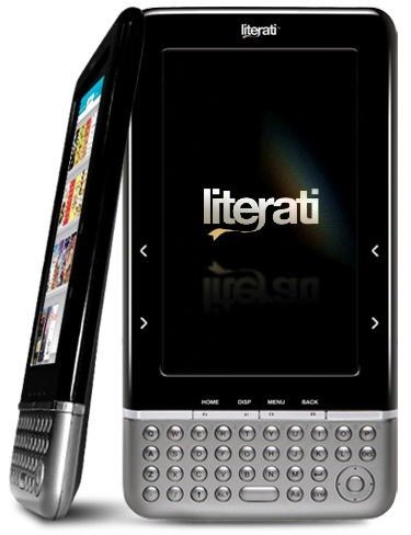 Новинка внешне напоминает какой-то не самый новый коммуникатор, но большего (чем эти устройства) размера. Literati имеет цветной 7-и дюймовый дисплей с довольно странным, на мой взгляд, разрешением 800х480, а также обладает возможностью соединяться по беспроводной технологии WiFi. "Читалка" будет доступна в чёрном и белом исполнении. Якобы совершенно бесплатно покупателю устройства подарят 150 электронных книг (25 загружено в память устройства, остальные - можно будет бесплатно скачать на неназванном пока сайте). На корпусе Literati можно также найти клавиатуру и (эта информация не подтверждена) слот для карточек памяти.
