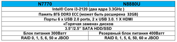 Модели N7770 и N8880U обладают абсолютной надежностью в отношении хранимой информации и ее защищенности. Тонкое резервирование. Восстановление данных. Снимки данных (Btrfs). Система защиты даных в целях их восстановления или локальное резервное копирование, а также копирование в «облако» с помощью сервисов DropBox, ElephantDrive и Amazon S3. В комплекте с устройствами поставляются программы Acronis True Image для резервного копирования клиентских данных и восстановления данных в случае непредвиденной потери, а также Intel Security для антивирусной защиты.