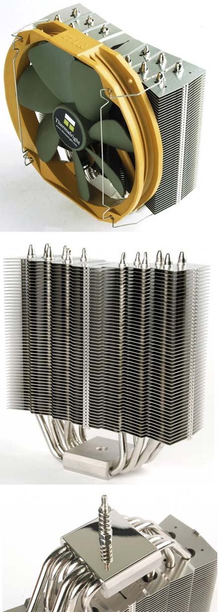 Thermalright считает, что улучшить можно и нужно вентилятор, ведь мало кого можно удивить в наше время 140мм "вертушкой", другое дело 150мм "карлсон". Так что теперь на знакомом нам радиаторе восседает новая разработка компании, что получила незамысловатое название TY-150. Сам радиатор имеет габариты 70х155х53мм, а вентилятор обладает размерами 160х140х26.5мм. Скорость вращения его лопастей составляет от 500 до 1100 оборотов в минуту при уровне шума в 23 децибела.