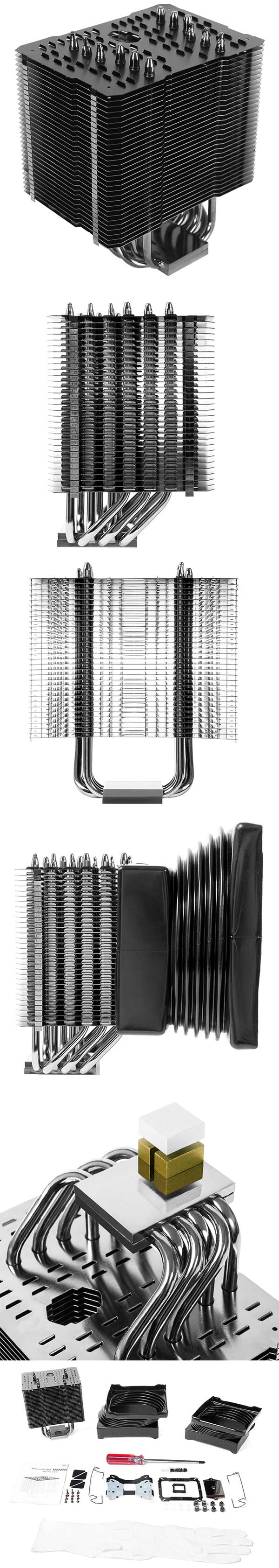 Речь о процессором кулере Macho (HR-02), которым ваш покорный слуга с удовольствием пользуется практически с момента релиза последнего на рынок. Thermalright решила ничего не менять в конструкции аппарата, правда покрасила его в чёрный цвет (чёрное никелированное покрытие на алюминиевом радиаторе и теплотрубках), убрала из комплекта 140мм вентилятор, но добавила туда нечто под названием "наружный контур", служит который для частично пассивного охлаждения процессора.