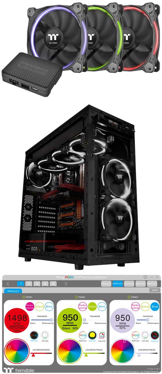 Вентилятор продаётся только в комплекте с ещё парой своих братьев и изделием, именуемым Fan Hub, к которому все три вентилятора присоединяются для работы. Для настройки скорости вращения лопастей и цвета подсветки используется софт Riing RGB Software.