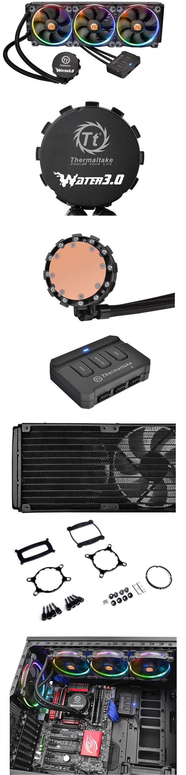 Новинка получила имя Water 3.0 Riing RGB 360, конструкция представляет собой сочетание медного совмещённого с помпой водоблока, идущих от него шлангов к 360мм радиатору, с установленными на последнем тремя 120x120x25мм вентиляторами Riing 12 LED RGB. "Вертушки" вращаются на скорости от 800 до 1500 в обычном режиме и на 400~1000 об/мин в режиме низкого уровня шума.