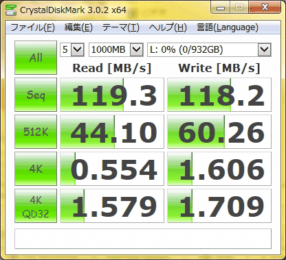 Первый тест - CrystalDiskMark, нам показывают работу с данными объёмом 1000МБ, каждый тест гонялся 5 раз: