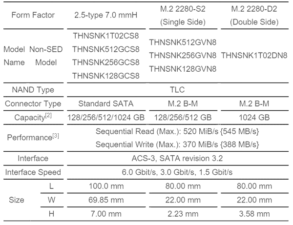 Эх, похоже прошли те времена, когда SSD были в 2.5" виде в 95% случаев, теперь всем подавай M.2... что Toshiba и организовала с SG5. Новое семейство представлено как в 2.5" SATA 6Гб/с виде, так и в M.2, причём как 2280-S2, так и 2280-D2, т.е. одностороннем и двустороннем вариантах. Спецификации решений серии можно оценить в табличке ниже, представленной нам в виде графического файла: