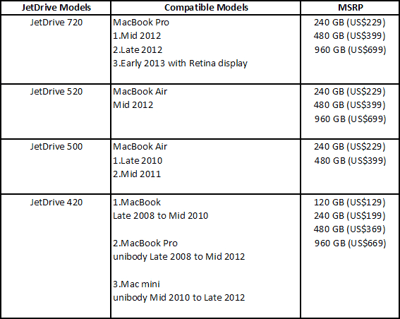 В табличке ниже расписаны наименования твердотельных накопителей JetDrive (первый столбик), далее указаны совместимые с ними модели (столбик 2) MacBook и уже потом стоимость: