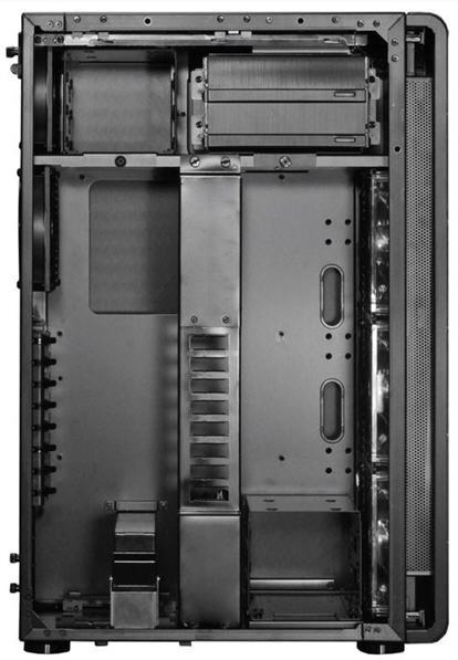 Внутри шасси есть специальное место для 2.5" твердотельного накопителя или же винчестера. Всё это дело устанавливается без помощи инструментов, ровно как и PCI-устройства. Как это модно в последнее время, корпус покрашен в чёрный цвет и внутри и снаружи. Имеются отверстия на задней стенке для шлангов СВО/СЖО.