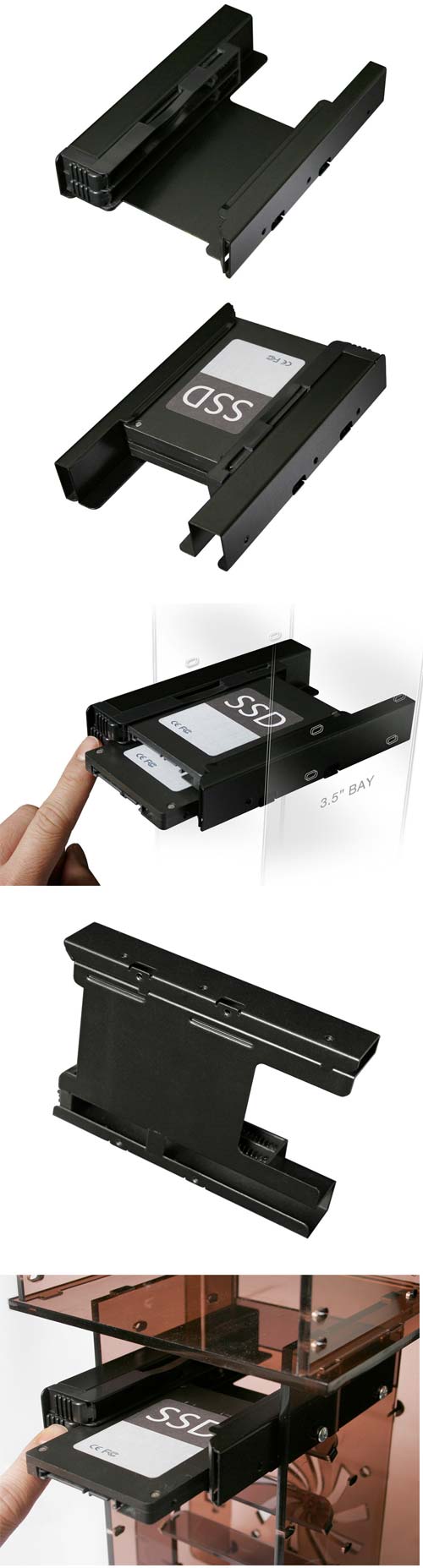 ...закрепить 2.5" накопитель любой толщины (вплоть до 9.5мм) в 3.5" отсек системного блока. Устройство создано таким образом, чтобы у его пользователя не было трудностей с помещением / извлечением накопителя из ПК, т.е. делается это легко и без использования инструментов.