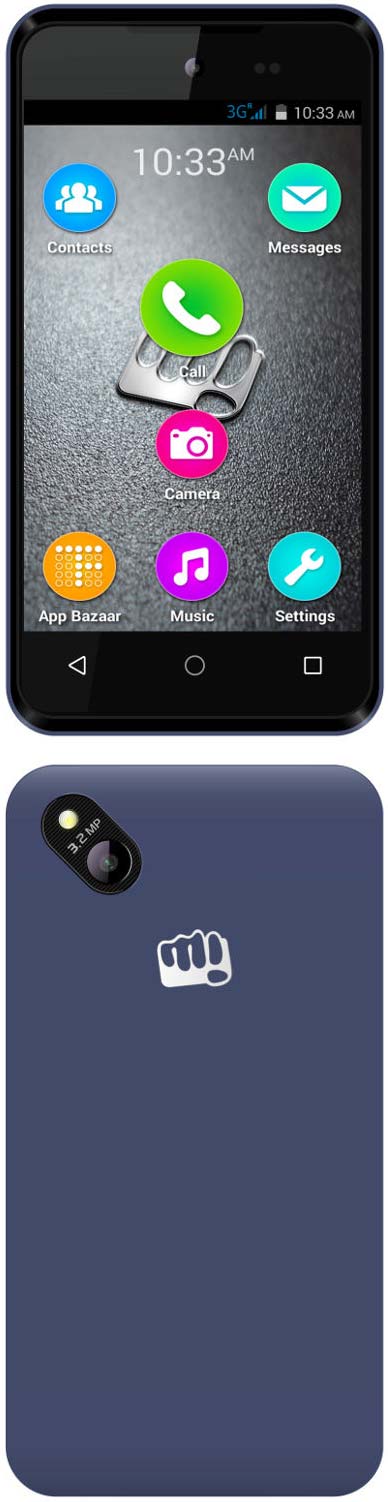У смартфона производства Micromax две камеры - 3.2МП тыловая с фиксированной фокусировкой и LED вспышкой, а также 0.3МП фронтальная. Есть поддержка 3G HSPA+, 802.11 b/g/n WiFi, Bluetooth 4.0 и A-GPS, в наличии FM тюнер и 3.5мм аудиовыход. Единственный доступный цвет аппарата - синий.