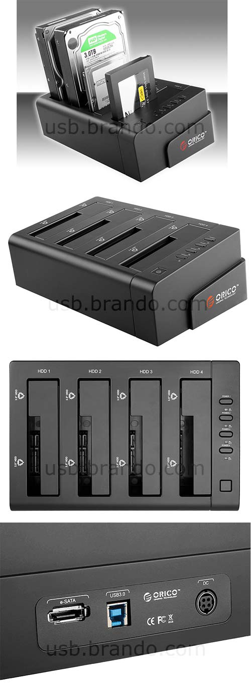 Итак, перед нами безымянная док-станция для SATA накопителей, в которую последних влезет аж четыре штуки, причём как 2.5", так и 3.5". Максимальная ёмкость накопителя равна 3ТБ, т.е. в девайс от Orico засунуть винчестеров общей ёмкостью аж 12ТБ, что довольно неплохо. Благодаря скоростному подключению по eSATA и ещё более скоростному по USB 3.0, чтение с накопителей и запись на них будет осуществляться довольно-таки шустро.