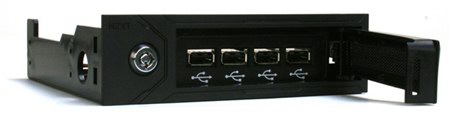 Оно монтируется в 5.25" отсек ПК и даёт доступ к четырём USB 2.0 портам. На корпусе девайса есть заглушка, которая прикрывает коннекторы USB (и порты), так что вытащить девайс из порта, не повредив его (девайс) при этом и оставшись незамеченным, крайне проблематично. Заглушка запирается на ключ (как я понял, используется хитрая система, которая не позволит одному владельцу Bunker открыть замок заглушки другого) и сделана из какого-то надёжного материала, что делает жизнь нехороших людей ещё горче. В определённых обстоятельствах сей продукт вполне полезен, нельзя не согласиться.