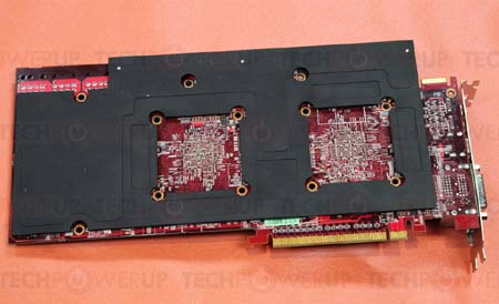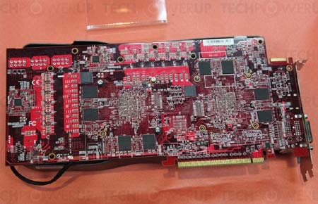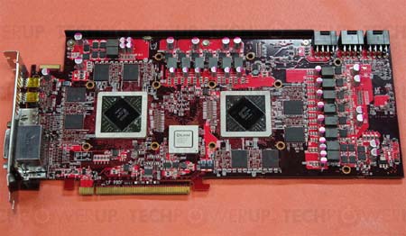 На огромной печатной плате (сообщается, что она выше HD 6990, но короче) красного цвета расположились два ядра Cayman с 3072 потоковыми процессорами, тактовой частотой 880МГц и 4ГБ GDDR5 памяти (256-битный интерфейс), работающими на 5500МГц. Видеовыходы: HDMI, два DVI и два mini DisplayPort.