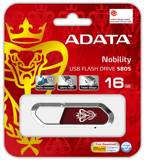 Флэш-накопитель S805 представлен в празднично-красном цветовом исполнении, а его емкость составляет целых 16 Гбайт. Он имеет прочный металлический корпус, украшенный изображениями королевской кобры. Форма полностью соответствует предназначению – S805 сделан в виде брелока для ключей с креплением типа «карабин», что позволяет легко закрепить USB-накопитель на элементах одежды, рюкзаке или сумке, превращая его в модный аксессуар. Специальный шарнирный механизм исключает вероятность потери защитного колпачка, а сам накопитель при этом обладает повышенной водостойкостью.