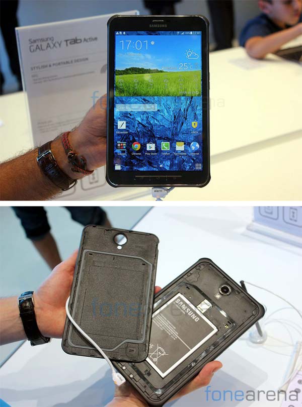 Аппарату именуется Galaxy Tab Active, обладает 8" экраном с разрешением 1280x800, основан на 1.2ГГц 4-ядерной SoC, имеет полтора гигабайта оперативной памяти и 16ГБ памяти флеш типа, которую разрешается расширить на 64ГБ карточками microSDXC. Особенность планшета в том, что он защищён от пыли и влаги (IP67), упакован в противоударный корпус.
