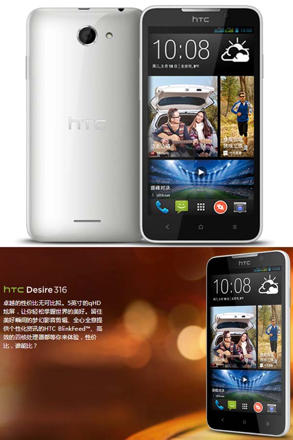 Умный телефон получил имя Desire 316, у аппарата 5" экран с разрешением 960x540, он IPS типа, а значит будет легко читаем под любым углом. Сердцем девайса стала некая 1.2ГГц четырёхъядерная SoC, объём оперативной памяти не назвать впечатляющим - 512МБ, места для ОС Android 4.3 и файлов пользователя всего 4ГБ, его разрешается расширить на 32ГБ.