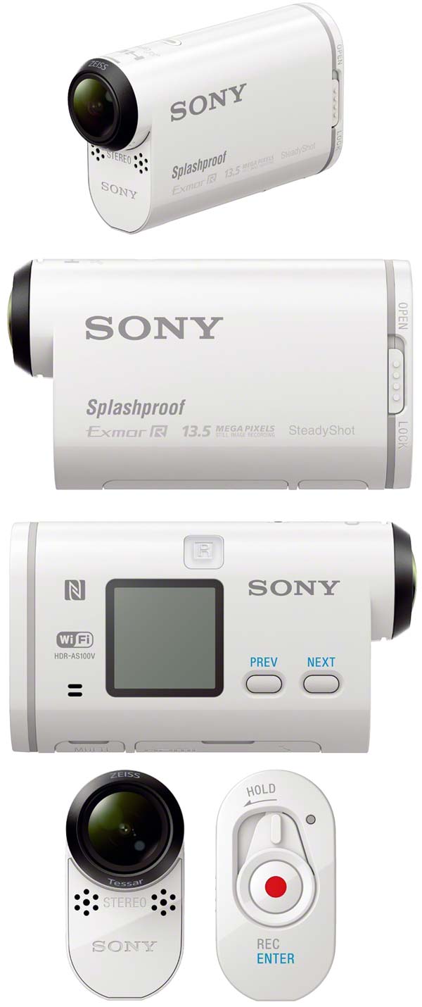 Камера поставляется как с пультом (HDR-AS100VR), так и без него (HDR-AS100V). Пульт RM-LVR1 позволяет начинать/прекращать запись одновременно на пяти таких камерах, также разрешает регулировать угол обзора новинок от Sony. Версия без пульта стоит 33000 йен (~11349 рублей), а с ним на 10000 йен (~14788 рублей) дороже.