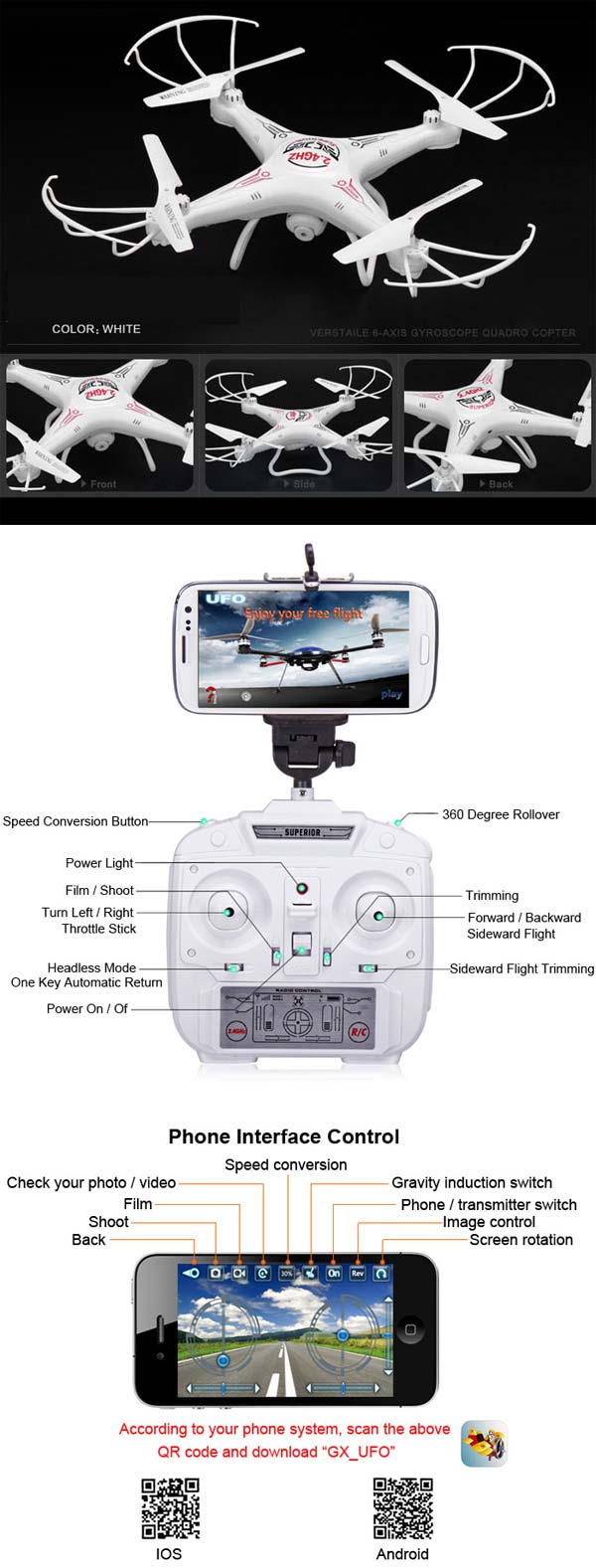 Аппарат SHENGKAI D97 имеет размеры 320x320x90мм, оборудован 2МП камерой, изображение с которой может как записываться на карту памяти, так и стримиться на умное устройство управляемое iOS или Android, для связи используется WiFi. Управлять агрегатом предлагается как с помощью беспроводного комплектного пульта Д/У, так и со смартфона/планшета с установленным приложением.
