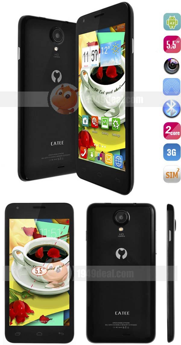 Благодаря экрану с диагональю 5.5" аппарат Catee CT550 называется планшетофоном. У изделия 1.3ГГц двухъядерная SoC MTK6572, 512МБ оперативной памяти, 4ГБ флеш расширяемой (на 16ГБ максимум) памяти, два слота для SIM карт (один их которых для Micro SIM карт). Разрешение экрана - 960x540, тип - IPS.