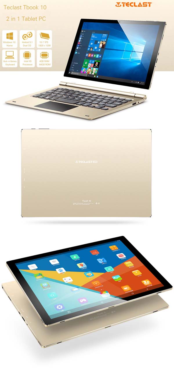Устройство называется Tbook 10, представляет собой планшет, способный становиться ноутбуком при присоединении к нему клавиатуры. Устройство основано на процессоре Intel Atom Z8300 (1.44ГГц, 4 ядра), обладает 4ГБ оперативной памяти и 64ГБ встроенной флеш памяти, расширение последней доступно максимум на 128ГБ с помощью карточек microSD/HC/XC.