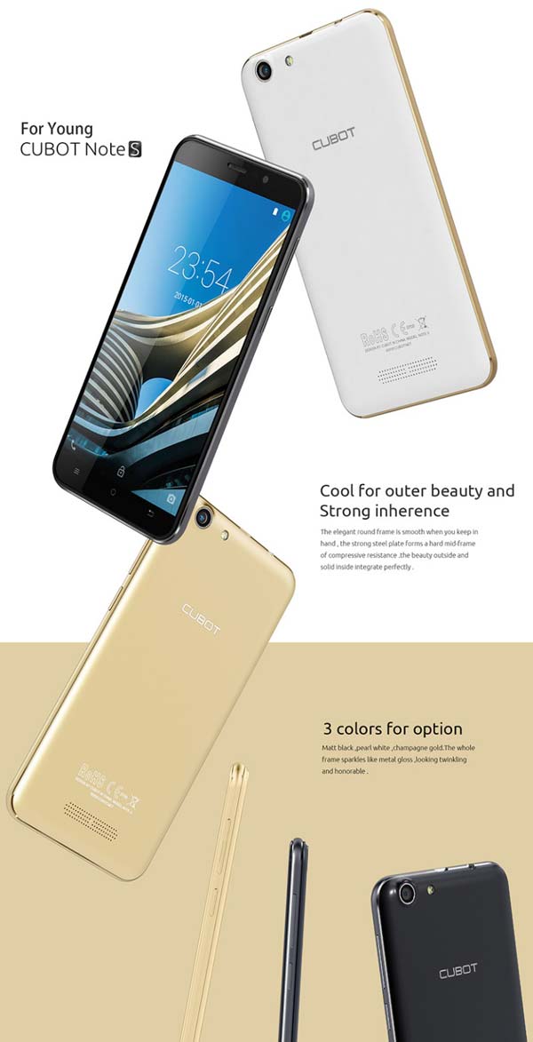 Cubot Note S обладает 5.5" IPS экраном с разрешением 720p, он ёмкостного типа и поддерживает 5-точечный Multi-touch. Основой аппарата стала 1.3ГГц 4-ядерная SoC MT6580 с графикой Mali-400MP, объём оперативной памяти равен 2 гигабайтам, флеш памяти в наличии 16 гигабайт, расширить её можно на 32 гигабайта.