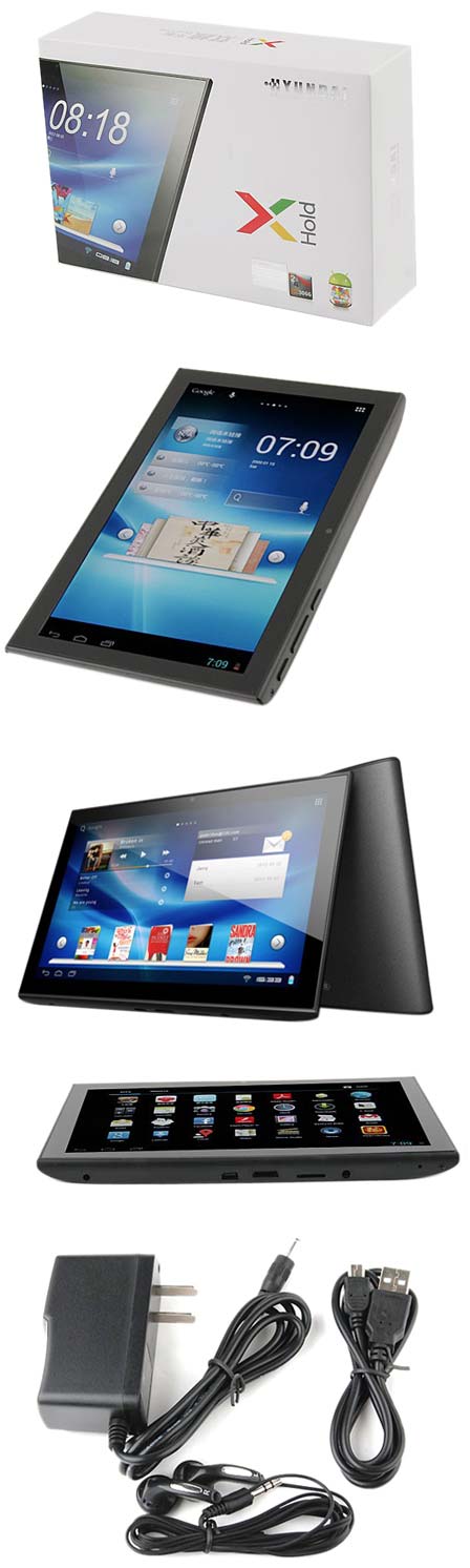 Спецификации планшета я взял с сайта Ownta, на котором сие изделие как раз и продаётся. У новинки 7" Multi-touch экран с разрешением 1024x600 пикселей, соотношение сторон - 16:9. В основе Hyundai X700 лежит процессор Rockchip RK3066 (ARM Cortex A9), функционирующий на тактовой частоте 1.6ГГц. Оперативной памяти у планшета имеется один гигабайт, тип - DDR3.