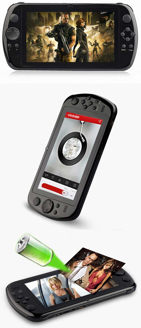 Изделие оснащено 3-осевым G-сенсором, питается от литий-ионной батареи на 5000 мАч. Изделие предназначено для игр, в том числе через эмуляторы, список поддерживаемых платформ весьма велик (и в некоторых случаях не кажется особенно правдивым): PSP/DC/ONS/NGP/NDS/N64/PS1/ARCADE/MAME/GBA/AFC/FC/MD/WSC/GBC/игры для Android.