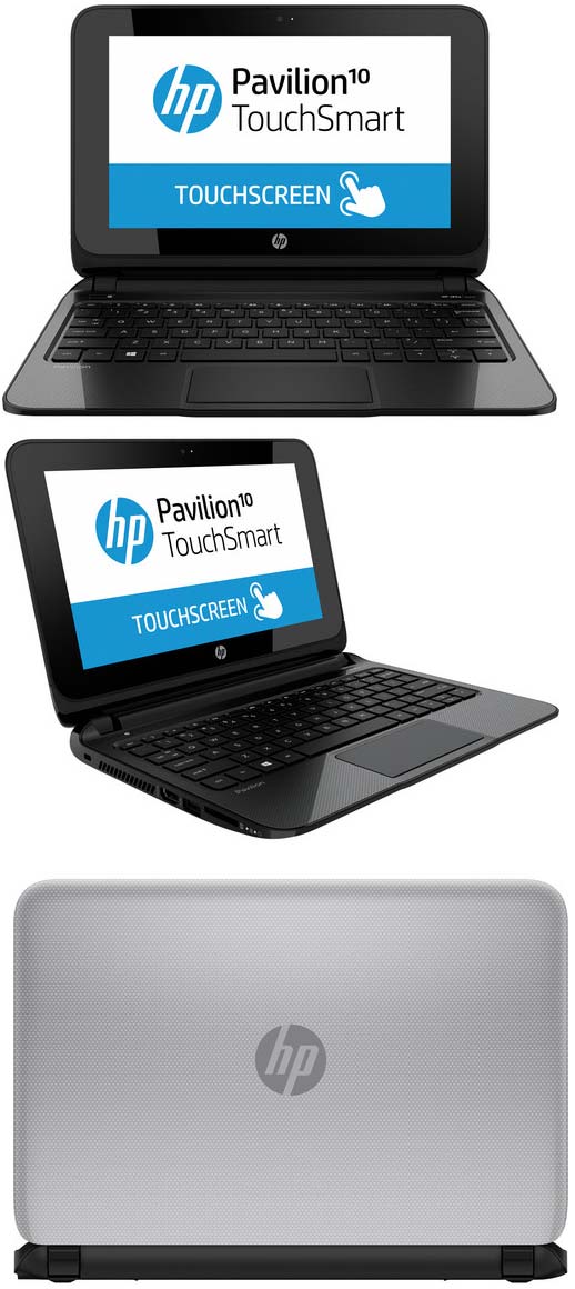 Аппарат имеет название Pavilion TouchSmart 10-e010nr, он основан на APU A4-1200 от AMD, имеет 2ГБ оперативной памяти DDR3L SO-DIMM (1066МГц), использует графическое решение AMD Radeon HD 8180. Экран аппарата имеет светодиодную подсветку, его диагональ составляет 10.1", разрешение равно 1366x768 пикселям, как уже было сказано, он сенсорный и поддерживает Multi-touch.