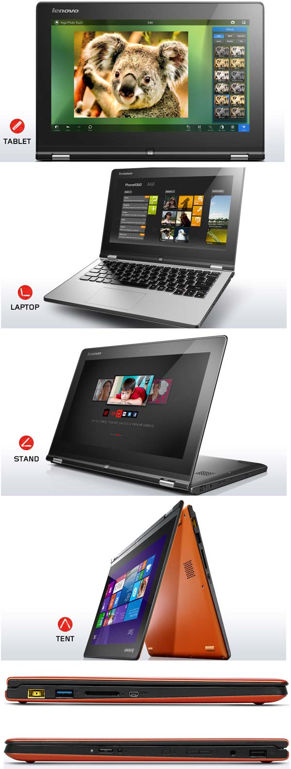 Аппарат Yoga 2 всё же по большей части является лэптопом, который можно использовать в качестве планшета. У изделия 11.6" сенсорный IPS экран с разрешением 1366x768, углы обзора которого составляют 178 градусов. В качестве процессора можно выбрать между Pentium N3520 и Celeron N2920, графическое решение интегрированное, объём оперативной памяти DDR3L равен 4ГБ.