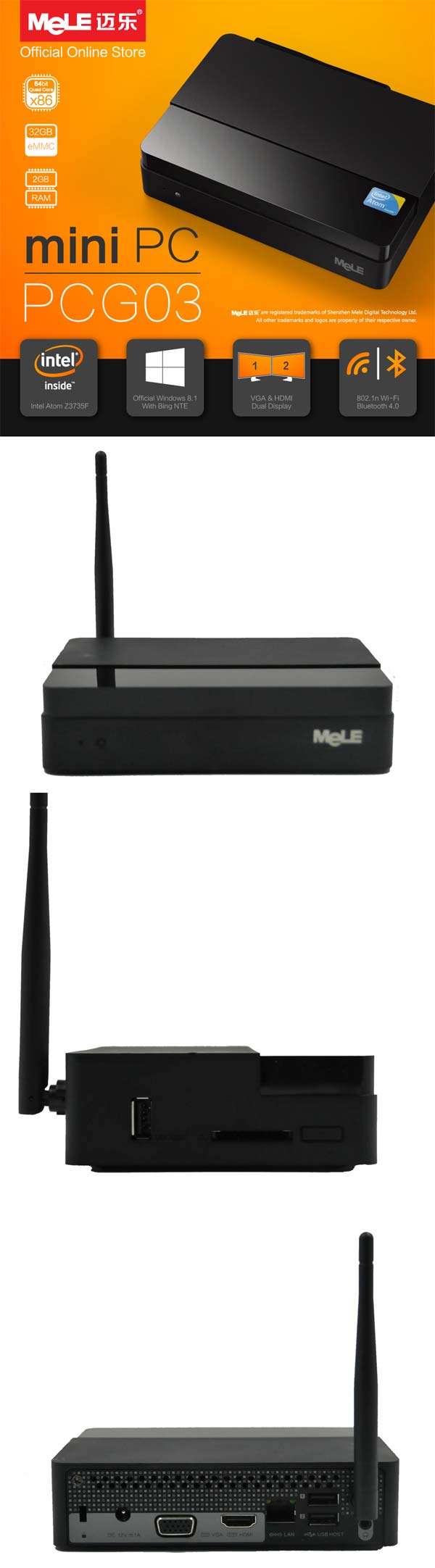 Изделие обладает 2ГБ оперативной памяти DDR3, имеет 32ГБ eMMC памяти, поддерживает её расширение за счёт карточек SD и внешних накопителей, подключить которых можно сразу несколько, ибо имеются три порта USB 2.0. Видеовыходы: HDMI и D-Sub/VGA, плюс имеется сетевая карта 100Мб/с, поддержка 802.11n/g/b WiFi. Размеры: 150x120x40мм, управляет продукт MeLe ОС Windows 8.1 с Bing, x86 версия.