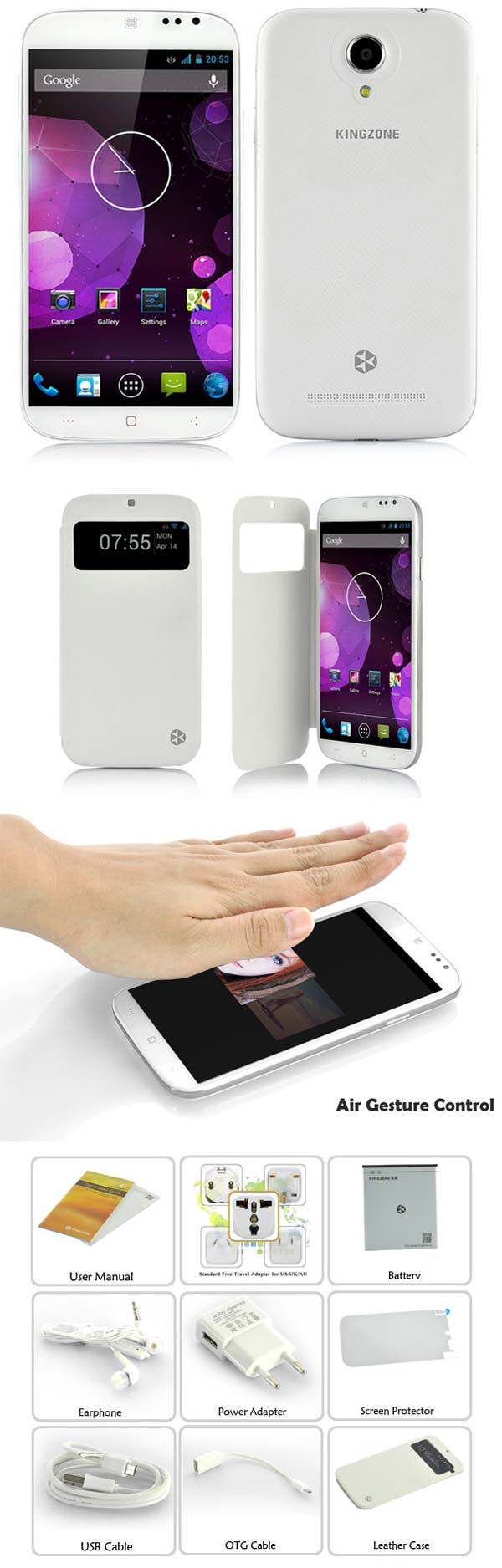 Kingzone S1 основан на 1.3ГГц четырёхъядерной SoC MTK6582, имеет 1ГБ оперативной памяти и 4ГБ встроенной расширяемой на 64ГБ (максимум) флеш памяти. Устройство оборудовано поддержкой работы в сетях 2G и 3G, дружит с WiFi и Bluetooth 4.0, ловит FM радиостанции, поддерживает OTG и управление жестами без контакта с тачскрином.
