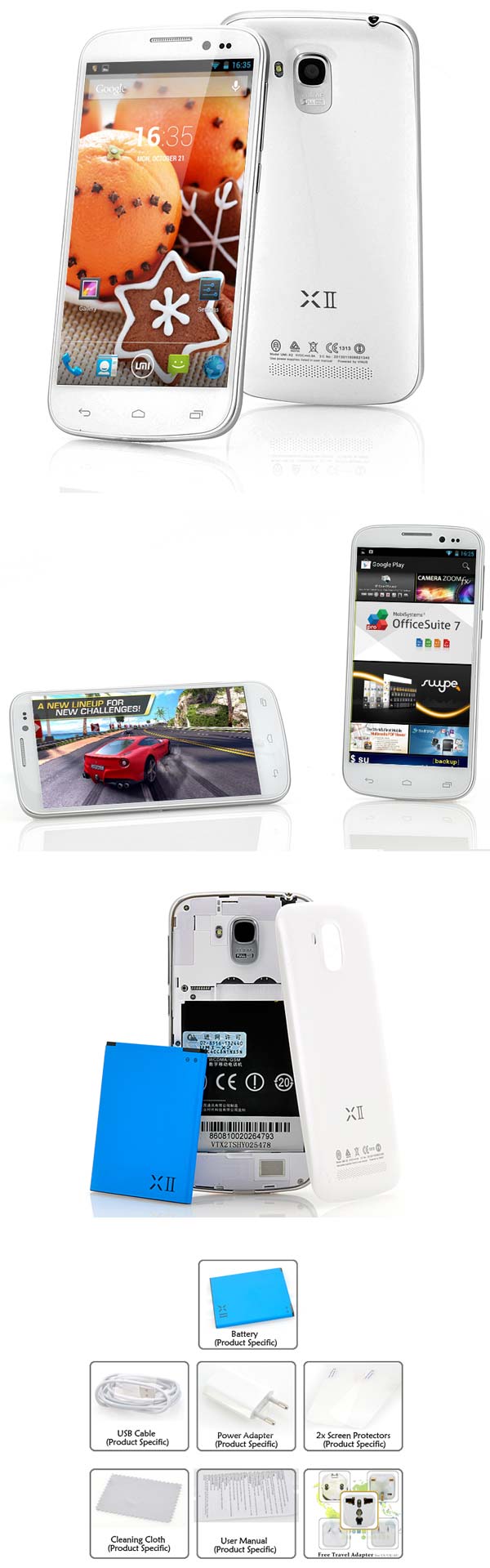 Управляемый Android 4.2 девайс может похвастаться 5" IPS OGS экраном с Full HD разрешением, показатель плотности пикселей которого равен 441PPI, дисплей сенсорный и поддерживает 5-точечный Multi-touch. У смартфона UMI X2 13МП задняя и 2МП фронтальная камера, также есть микрофон и динамик. Батарея имеет ёмкость 2520 мАч, изделие от неё работает около 3 часов в режиме разговора и до 72 часов в режиме ожидания.