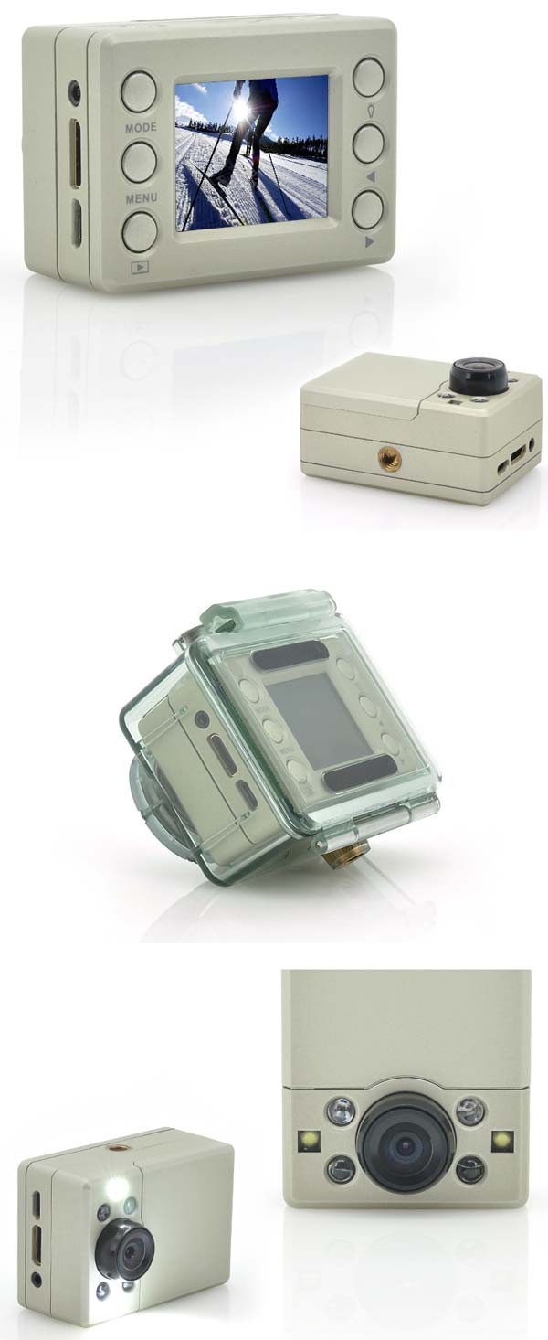 Основой экшн-камеры стал 5МП CMOS сенсор с 130° широкоугольным объективом и 4-кратным цифровым зумом. Изделие имеет четыре инфракрасных светодиода и два белых. Слот для карточек памяти microSD/HC/XC имеется, ровно как и видеовыход HDMI и порт Micro USB. Размеры новинки составляют 73x70x42мм, вес равен 133 граммам.