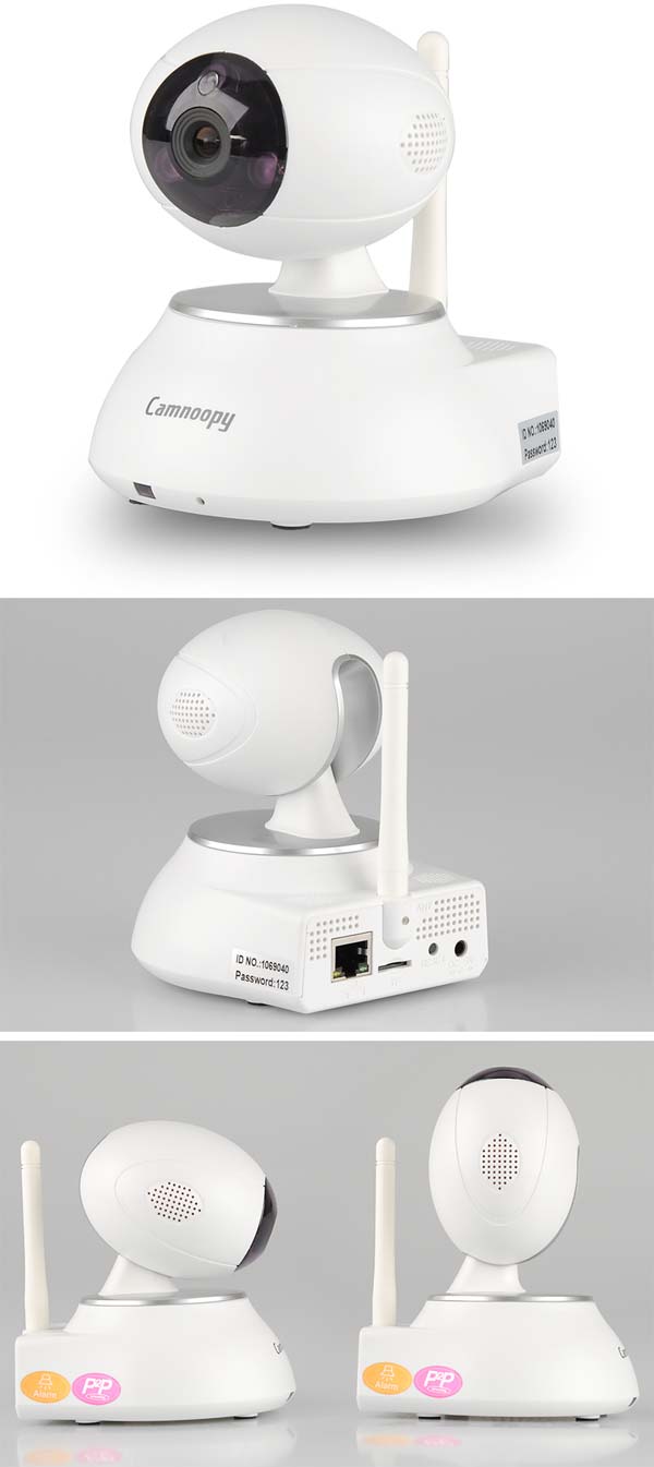 Аппарат именуется Camnoopy CN-PT100, в нём используется 1/4" CMOS сенсор, 3.6мм объектив с диафрагмой f/1.4. Видео пишется в разрешении вплоть до 720p, формат видео - H.264, FPS - от 1 до 30, угол обзора камеры - 60 градусов, по горизонтали устройство вертится на 355 градусов, по вертикали - на 120 градусов.
