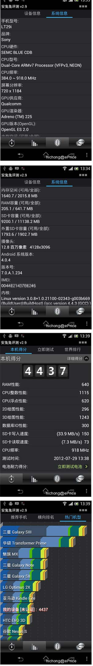 Помимо фото, они опубликовали и скриншоты с экрана устройства, в том числе - с бенчмарками. Но об этом позже, сейчас мы посмотрим на спецификации изделия Sony. Сердцем смартфона является двухъядерный Qualcomm Snapdragon S4 (Krait), у новинки 4.6" тачскрин с разрешением 720p, поддерживающий Sony Bravia Engine. Графическое решение - Adreno225, объём оперативной памяти - 1ГБ, а свободного места под файлы пользователя выделено 16ГБ.