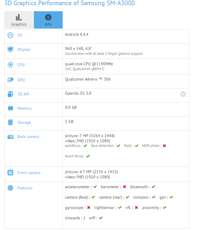 Обычно, разница в деньгах между доступным в общепринятом значении и понимании Samsung аппаратом может быть многократной, так что неизвестно, сколько она попросит за SM-A300, спецификации которого можно узреть на скриншоте ниже: