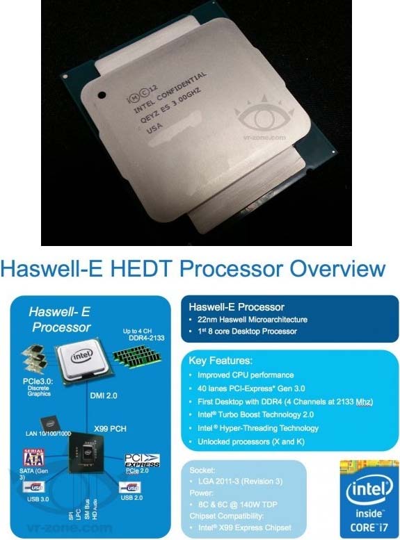 Нам предоставили фото первого процессора Core i7 HEDT (что расшифровывается как high-end desktop, а переводится примерно так - "десктопный процессор класса high-end"), относящегося к так называемому семейству Haswell-E. Изделие наверняка понравится энтузиастам, ведь оно будет первым процессором для домашних систем, который дружит с оперативной памятью DDR4 и обладает восемью ядрами.