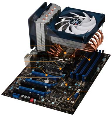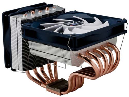Изделие необычной формы, хотя что-то похожее мне приходилось видеть раньше. В конструкции кулера используются два радиатора, связанные с медным никелированным основанием длиннющими теплотрубками, коих пять штук. На один из радиаторов дует 140мм вентилятор (скорость вращения его крыльчатки составляет 700-1800 об/мин, а объём перегоняемого воздуха - 34.78-89.43 кубических футов в минуту при шуме от 8.3 до 28.8 дБ), а на другой - 120мм (скорость вращения его крыльчатки составляет 800-2200 об/мин, а объём перегоняемого воздуха составляет 24.23-66.2 кубических футов в минуту при шуме от 15 до 35 дБ).
